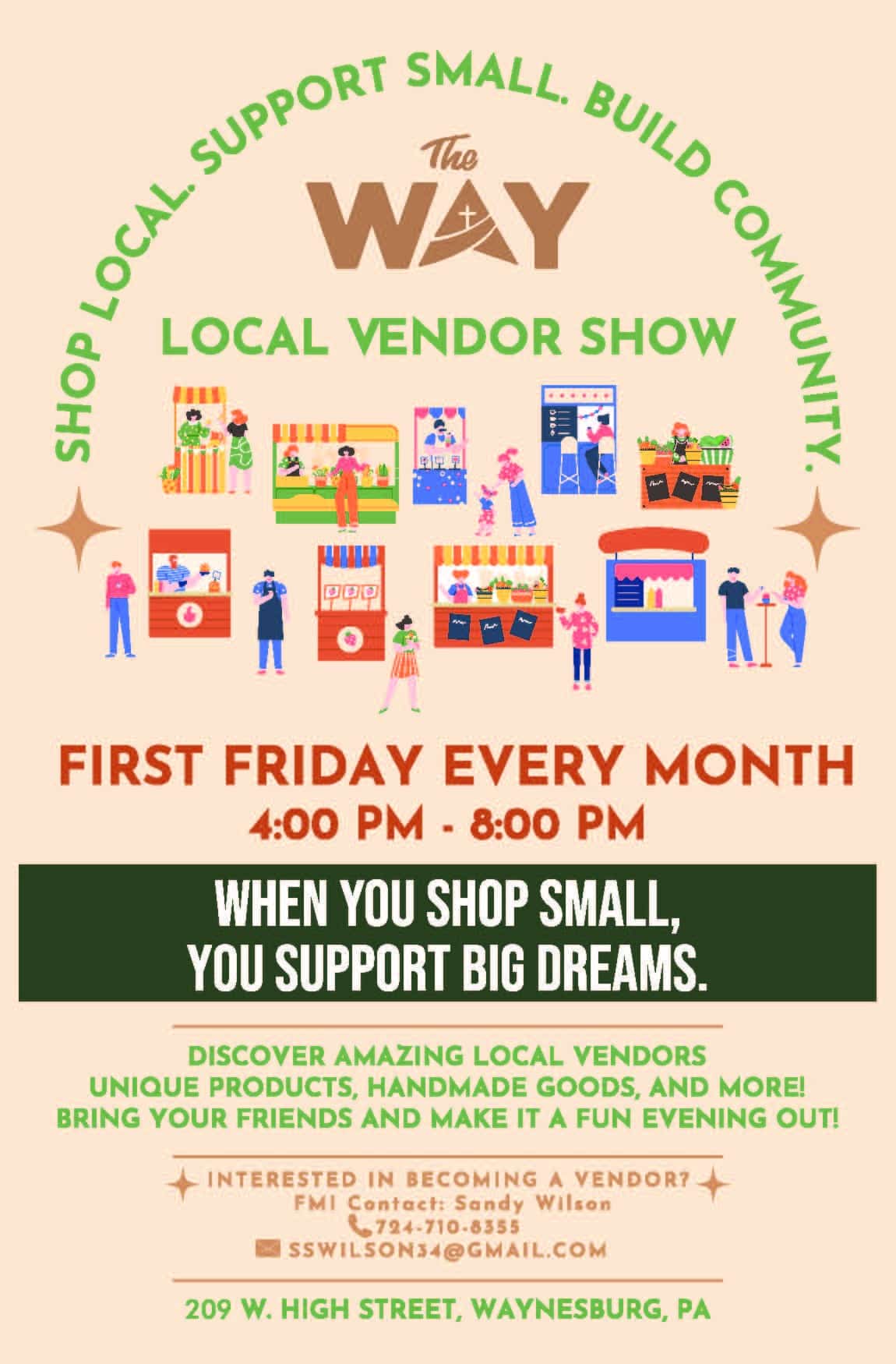 Flyer for The Way Local Vendor Show featuring illustrated vendor booths and shoppers, promoting a monthly event held the first Friday of every month from 4:00 PM to 8:00 PM at 209 W. High Street in Waynesburg, PA, encouraging people to shop local and support small businesses.
